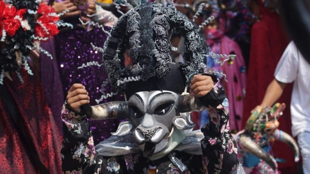 Los participantes, vestidos con trajes llenos de colores vibrantes, cascabeles que suenan al compás de sus pasos, hermosos arreglos florales y máscaras de toro talladas en madera, han cautivado a un público que se ha congregado para disfrutar de la festividad.